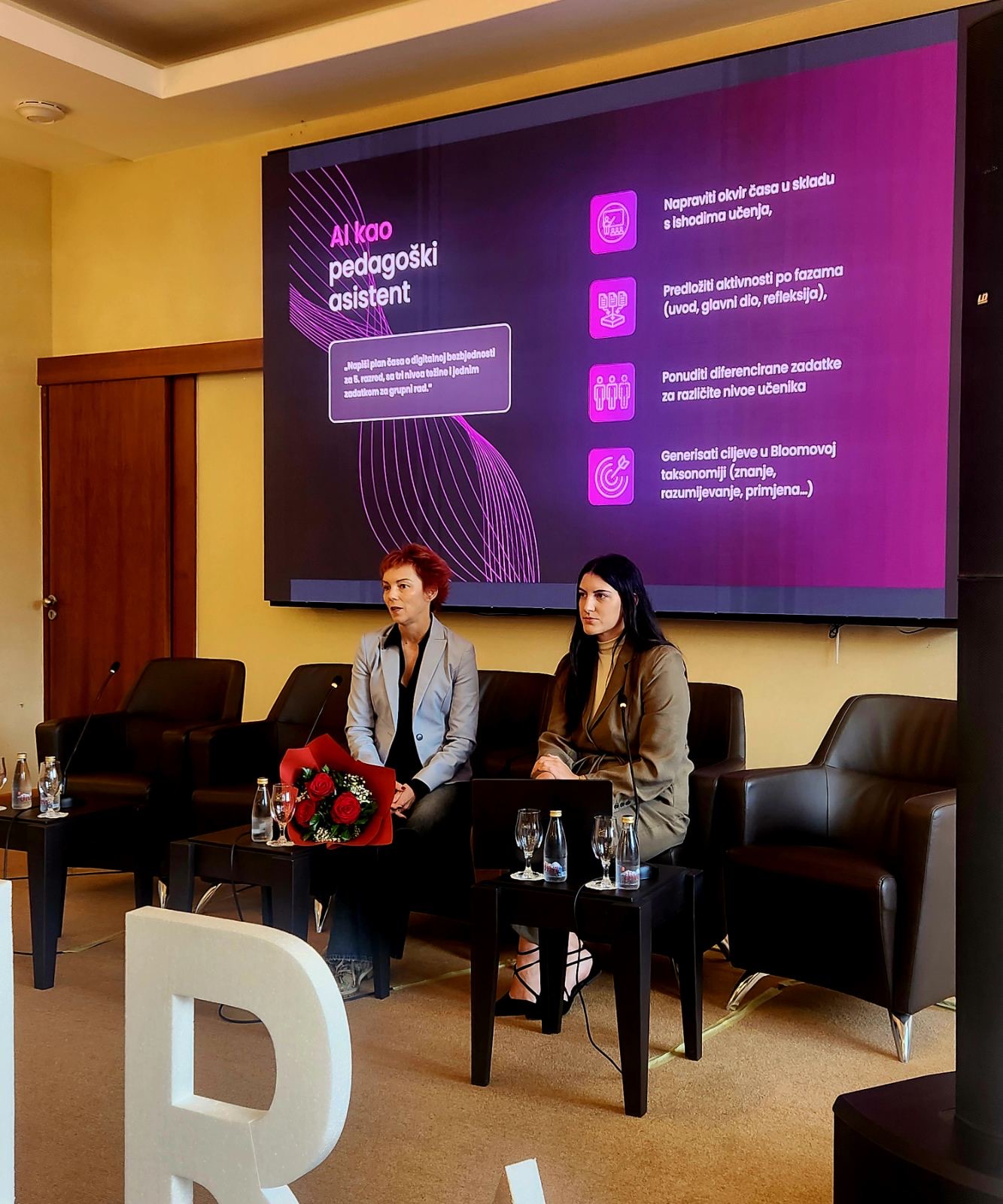 Drugog dana konferencije, u okviru plenarnih sesija, direktorica Ivana Kurtović i nastavnica informatike Mila Medinodržale su predavanje na temu „Primjena vještačke inteligencije u nastavi“, kroz koje su pokazale kako vještačka inteligencija može postati stvarni saveznik nastavnika – u planiranju časova, kreiranju nastavnih materijala, evaluaciji, administraciji i personalizaciji učenja.