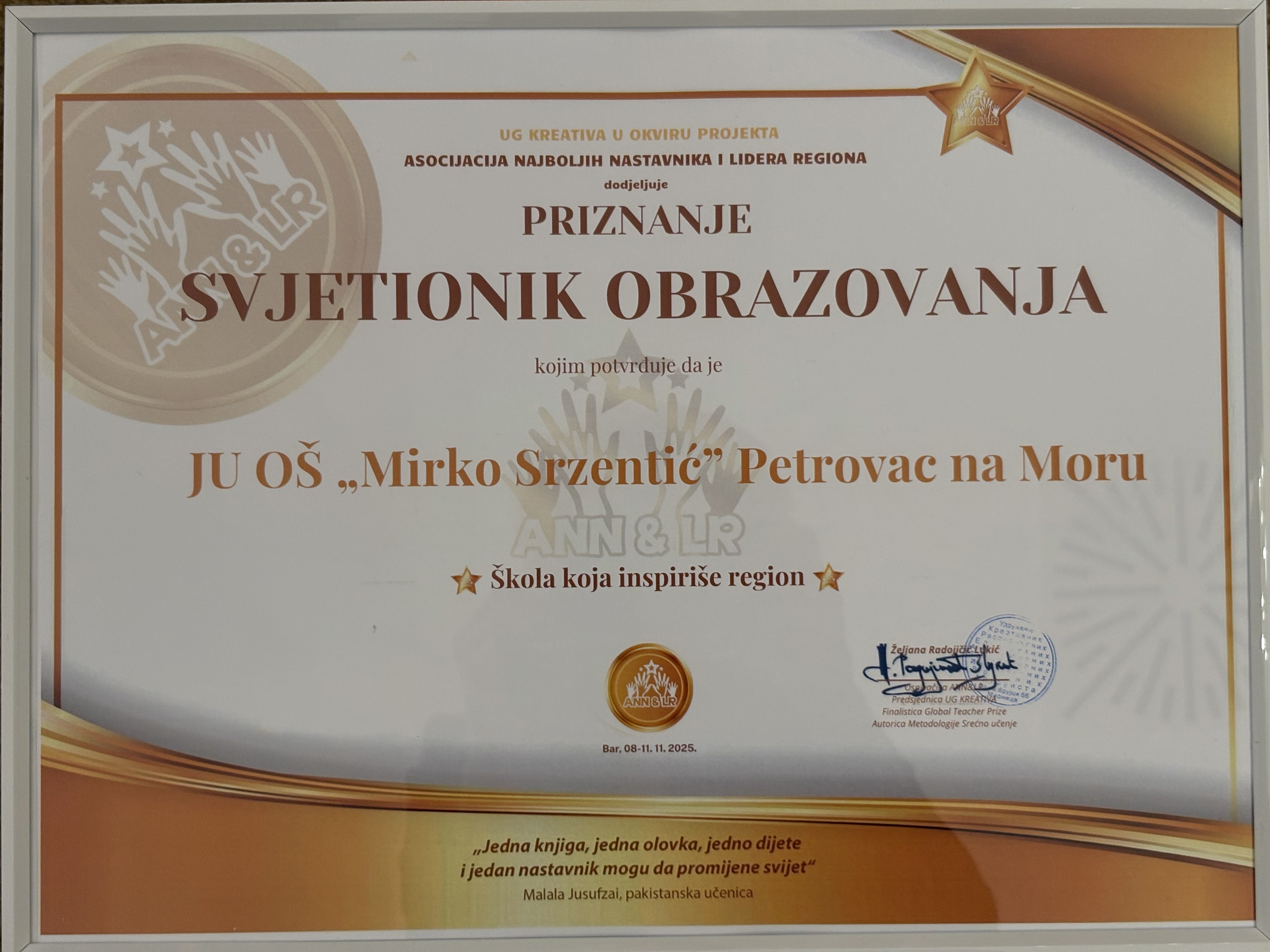 Priznanje je uručeno u okviru 9. Regionalne konferencije „Svijet obrazovanja briše granice“, koja je od 8. do 11. novembra okupila najbolje nastavnike i škole sa prostora bivše Jugoslavije, s ciljem razmjene iskustava, saradnje i promocije savremenih obrazovnih praksi.