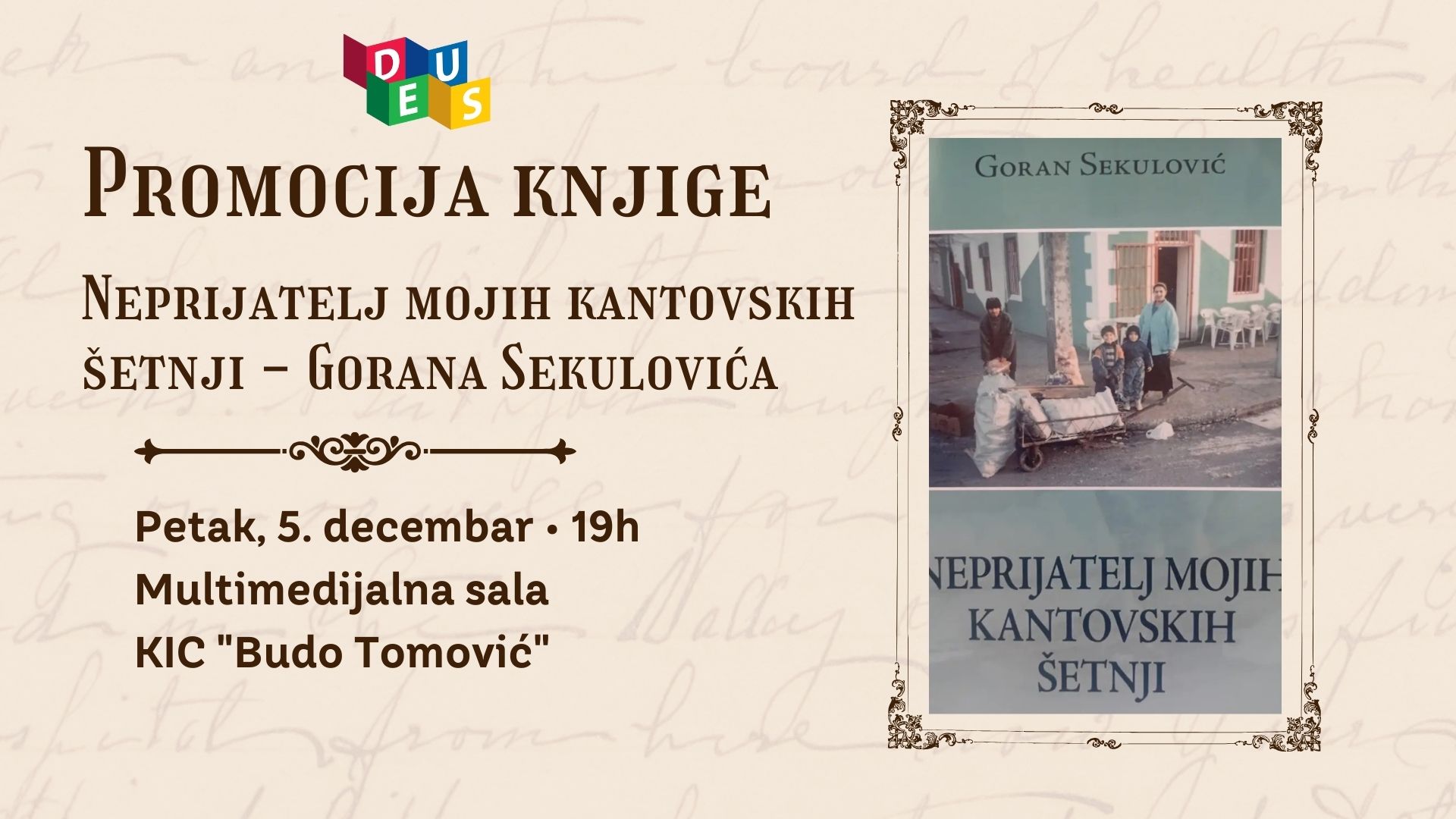 Promocija knjige pjesama i poetskih zapisa „Neprijatelj mojih kantovskih šetnji“', autora Gorana Sekulovića, održaće se u petak, 5. decembra, u 19 h, u Multimedijalnoj sali KIC-a „Budo Tomović“.