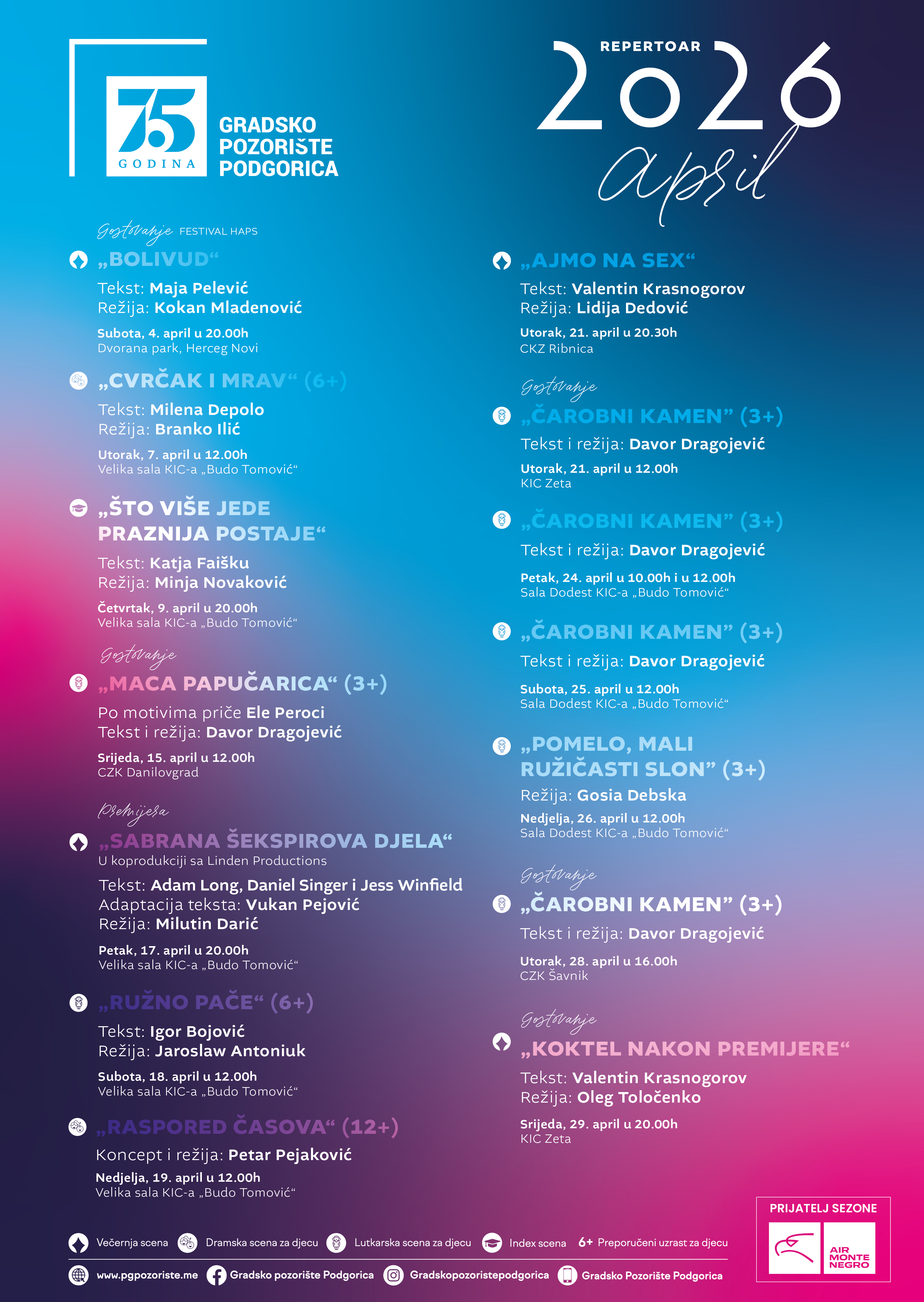 Gradsko pozorište Podgorica najavljuje repertoar za april 2026, sa izvođenjima u Podgorici i gostovanjima u više gradova.