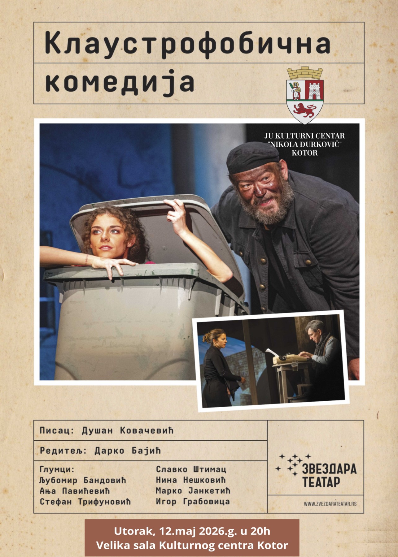 U utorak, 12. maja 2026. godine u 20 h, na Velikoj sceni kotorskog Kulturnog centra, biće izvedena gostujuća predstava „Klaustrofobična komedija“, rađena u produkciji Zvezdara teatra.