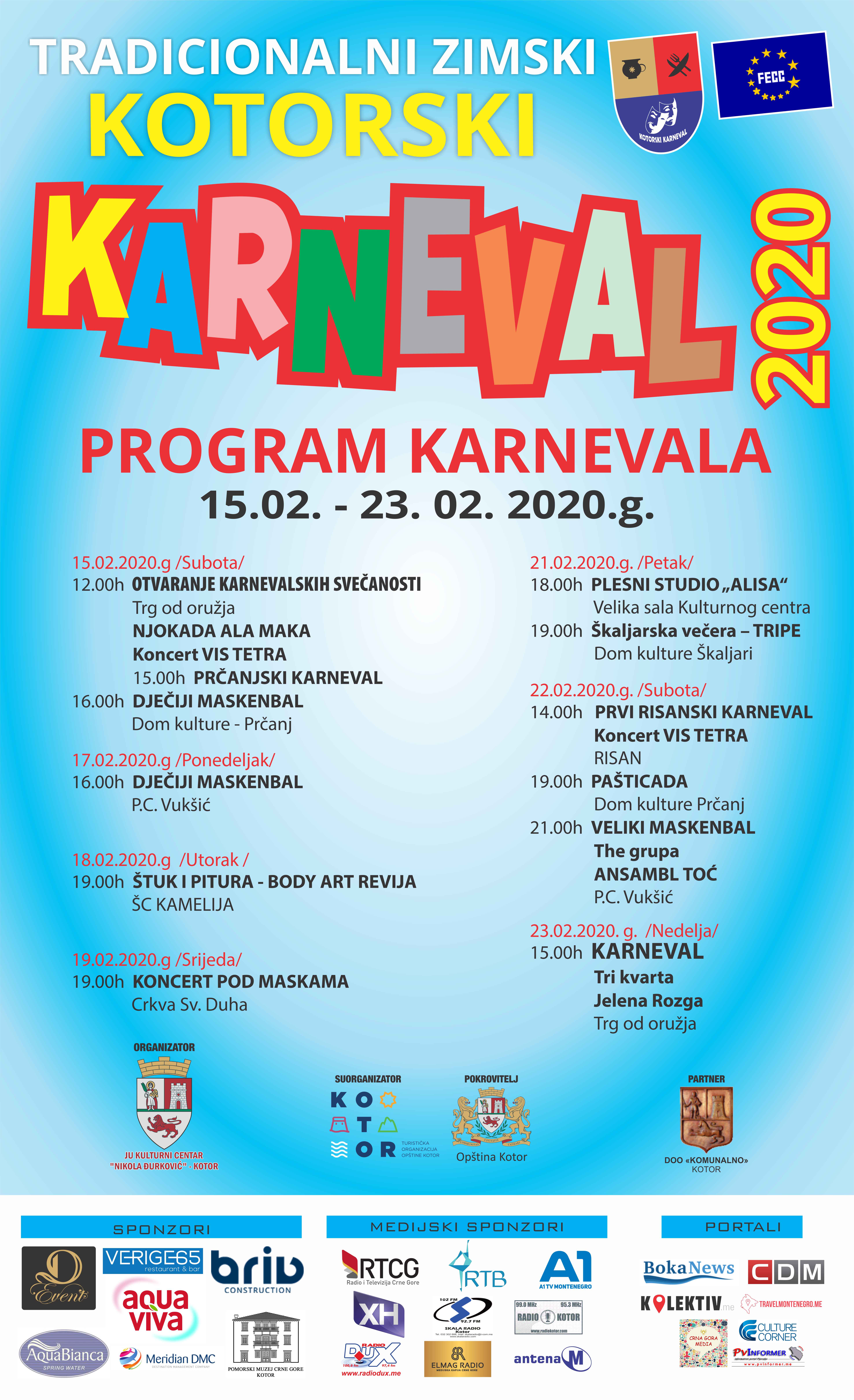 Tradicionalni zimski kotorski karneval 2020 održaće se u nedelju 23. 02.2020.g. sa početkom u 15h.