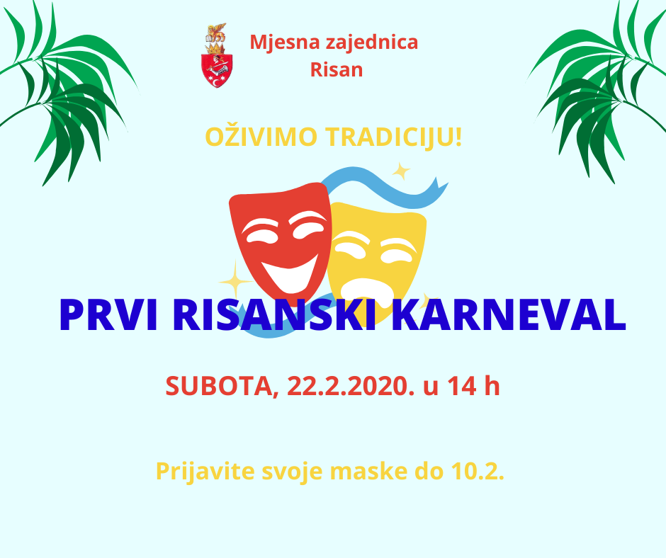 U subotu, 22. februara, u 14h, počinje Prvi Risanski karneval. Goste očekuje vesela karnevalska zabava uz brojne maske iz Risna i okoline, mažoretke, Gradsku muziku Kotor i VIS „Tetra“. Prijavljen je veliki broj grupnih i individualnih maski, tako da goste očekuje pravi defile maštovitih kreacija u ovoj prvoj risanskoj maškaradi.