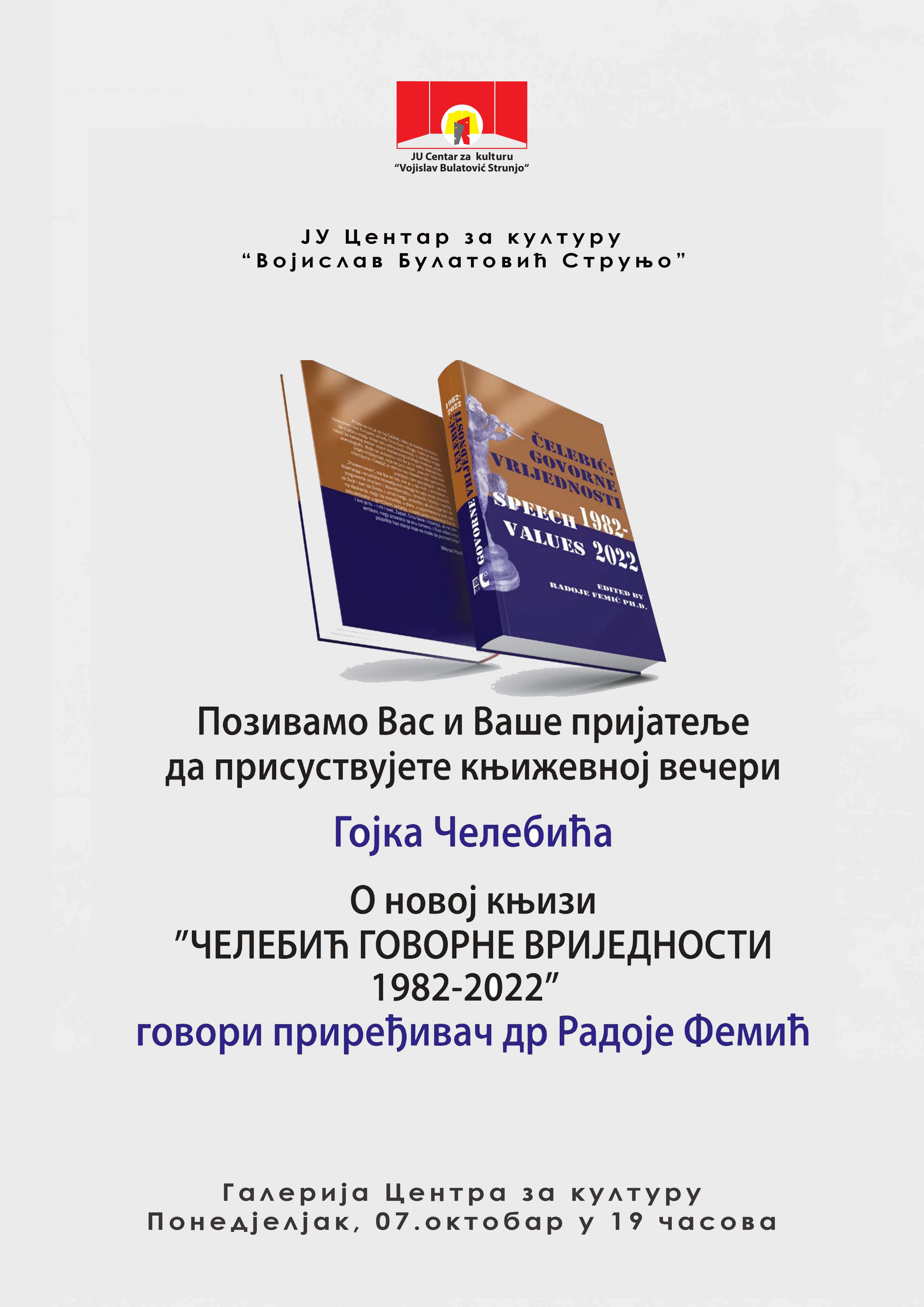 Književno veče Gojka Čelebića, na kome će biti predstavljena i knjiga ''Čelebić govorne vrijednosti 1982 - 2022'', priređivača dr Radoja Femića, biće upriličeno u ponedjeljak, 7. oktobra, u galeriji bjelopoljskog Centra za kulturu, sa početkom u 19 h.