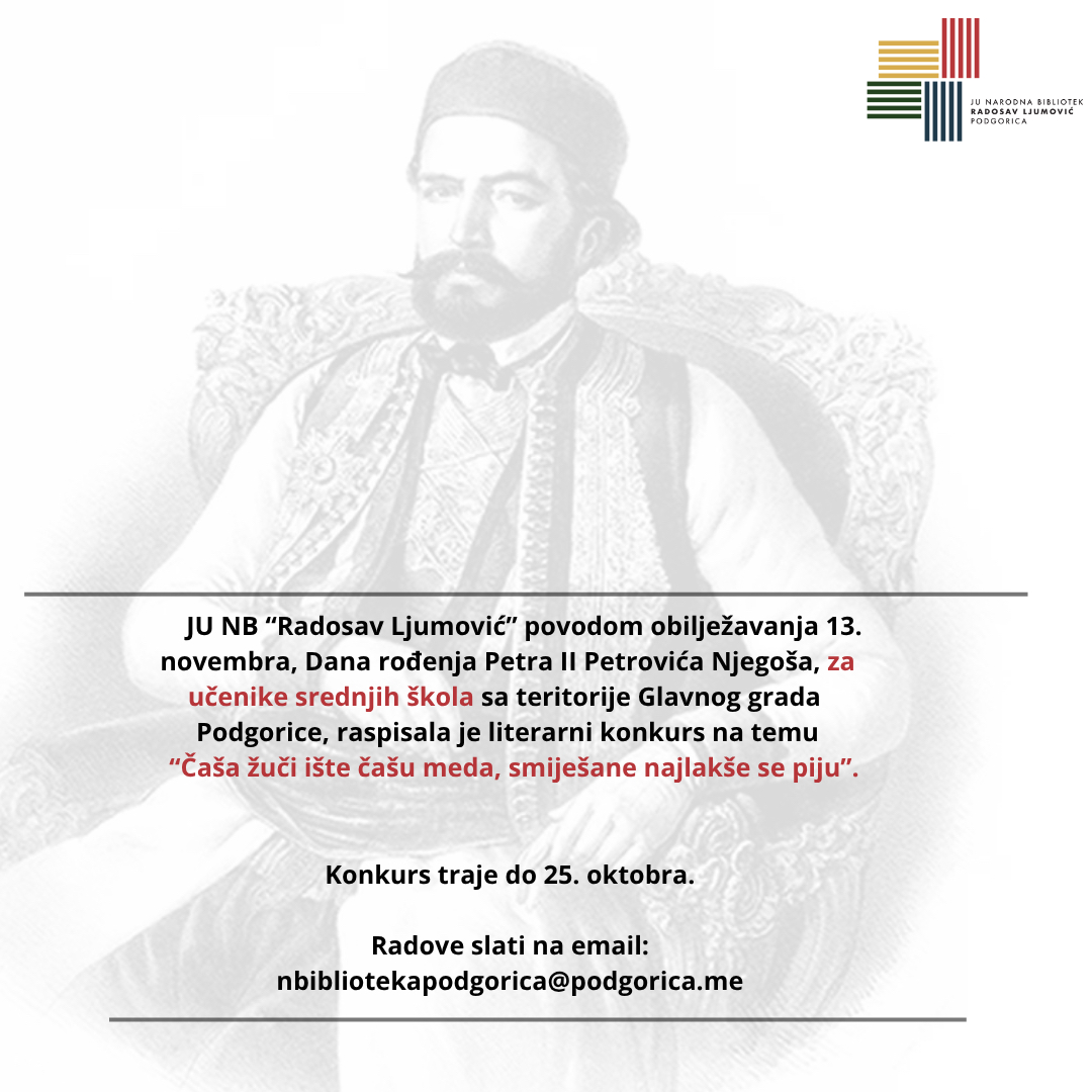 JU NB “Radosav Ljumović” povodom obilježavanja 13. novembra, Dana rođenja Petra II Petrovića Njegoša, za učenike osnovnih škola sa teritorije Glavnog grada Podgorice, raspisala je literarni konkurs na temu “Blago tome ko dovijek živi, imao se rašta i roditi”.