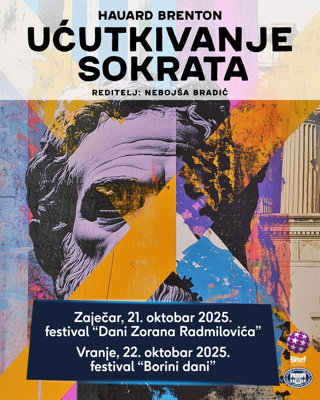 Predstava „Ućutkivanje Sokrata“, po tekstu Hauarda Brentona i u režiji Nebojše Bradića, okuplja ansambl vrhunskih glumaca: Bojana Dimitrijevića, Jugoslava Krajnova, Jelenu Stupljanin i Sanju Ristić Krajnov. Na dva dosadašnja festivalska učešća osvojila je tri nagrade.