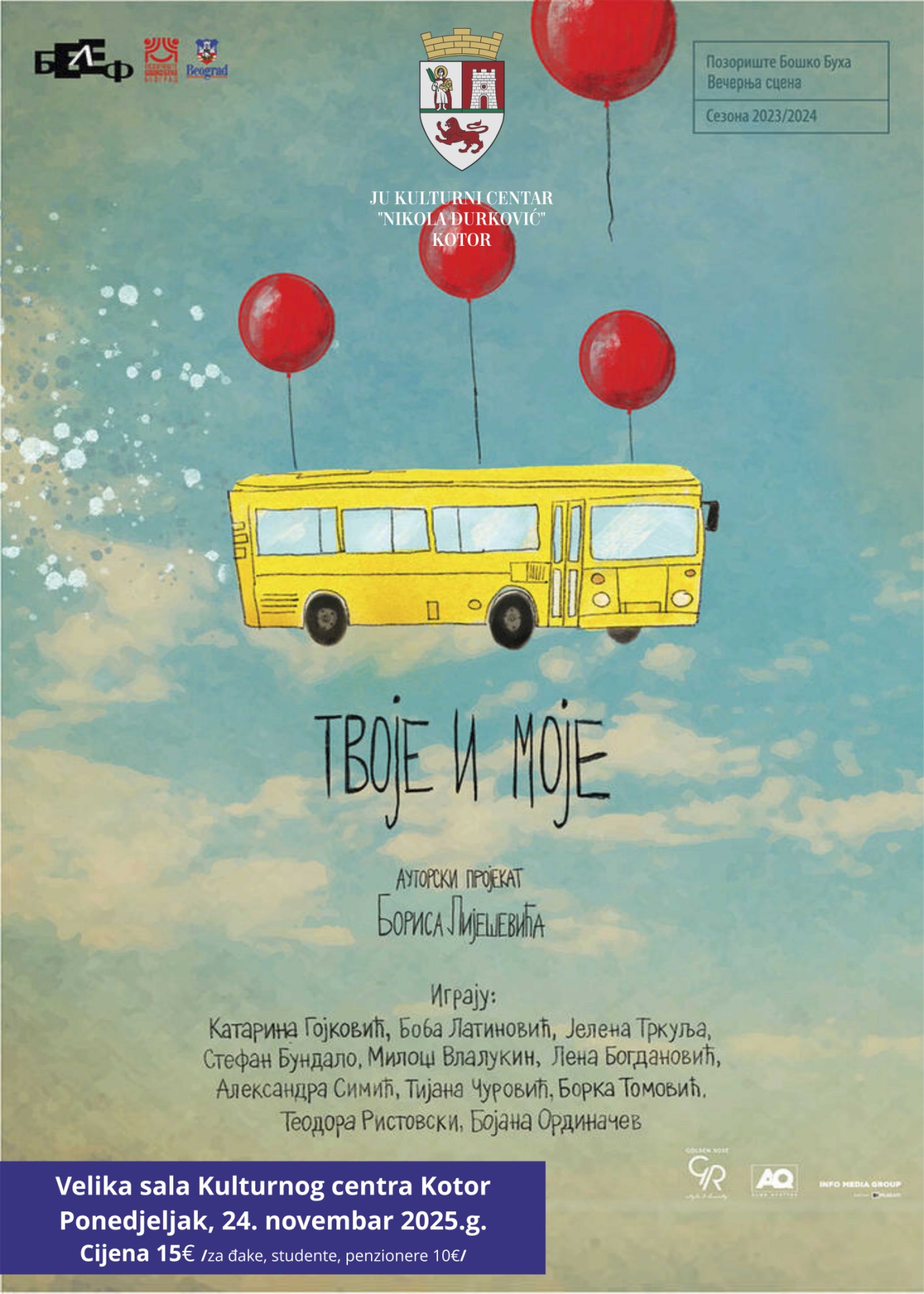 Autorski projekat Borisa Liješevića, predstava „Tvoje i moje“, rađena u produkciji pozorišta „Boško Buha“ iz Beograda, gostuje na Velikoj sceni Kulturnog centra Kotor u ponedjeljak, 24. novembra 2025. godine u 20 h.