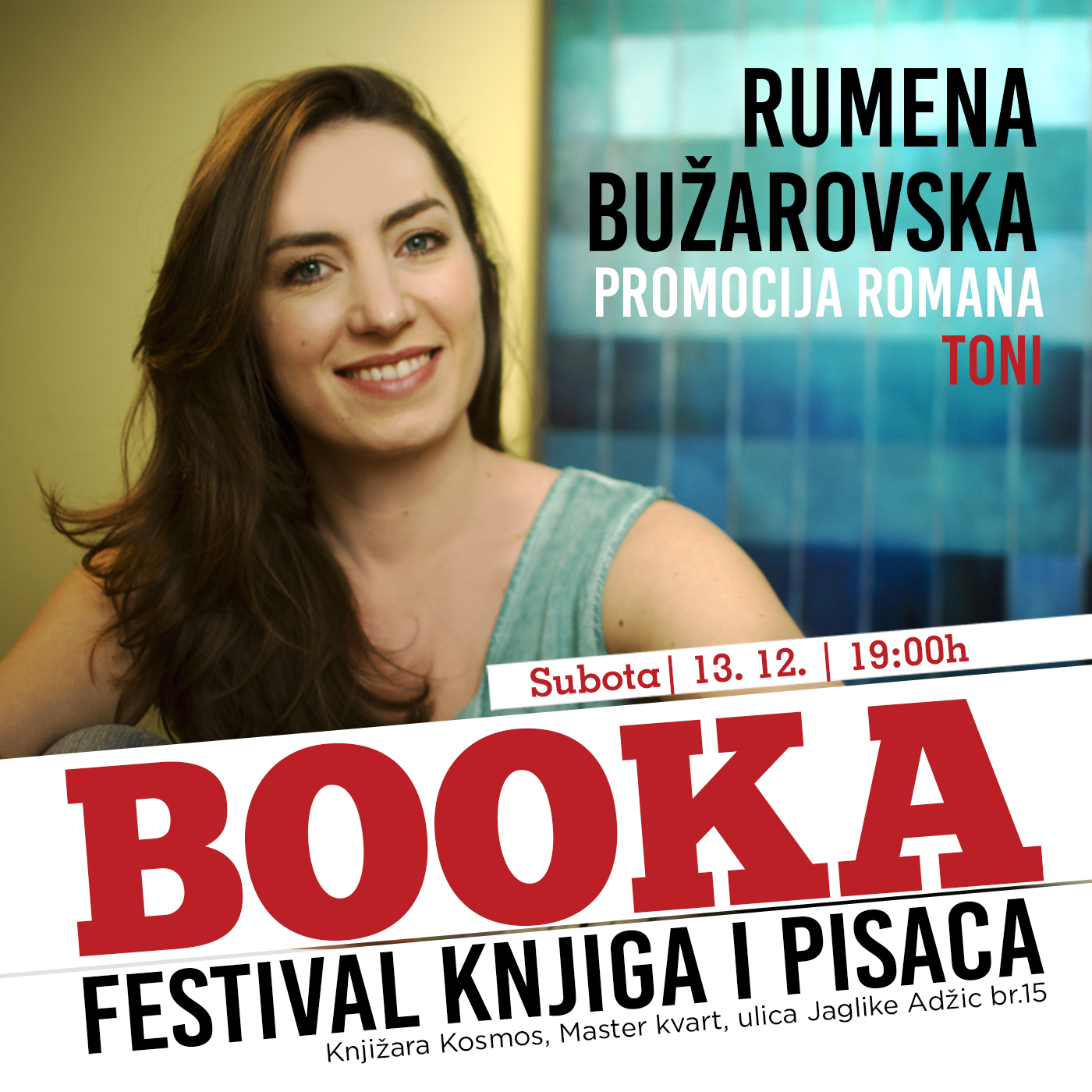 U subotu 13. decembra u 19 h u Kosmos knjižari u Master kvartu održaće se promocija romana Toni Rumene Bužarovske u okviru 17. festivala knjiga i pisaca BOOKA. Sa autorkom razgovara Marija Vujošević.