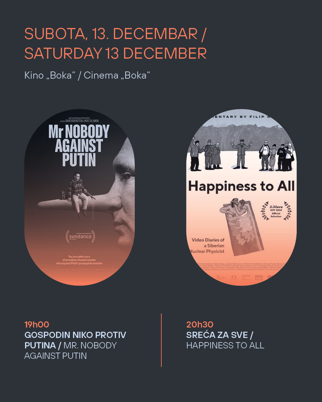 Od 17h00 publika će imati priliku da pogleda film „Gospodin Niko protiv Putina“ autora Davida Borensteina i Pavela Talankina. To je intiman, hrabar i uznemirujuće aktuelan portret čovjeka koji se, bez političke moći, zaštite ili društvenog statusa, usuđuje da uradi ono što većina ne smije ni da pomisli - da se otvoreno suprotstavi režimu Vladimira Putina. Film istražuje hrabrost, cijenu slobode i granice individualnog otpora u autoritarnom društvu.