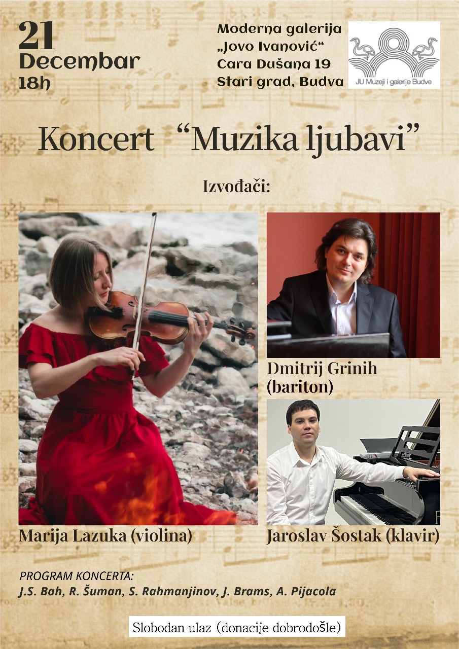 U organizaciji JU Muzeji i galerije Budve, u nedjelju, 21. decembra u 18 h u Modernoj galeriji „Jovo Ivanović” u Starom gradu u Budvi će biti održan koncert „Muzika ljubavi”. Izvođači su Marija Lazuka (violina), Dmitrij Grinih (bariton) i Jaroslav Šostak (klavir).
