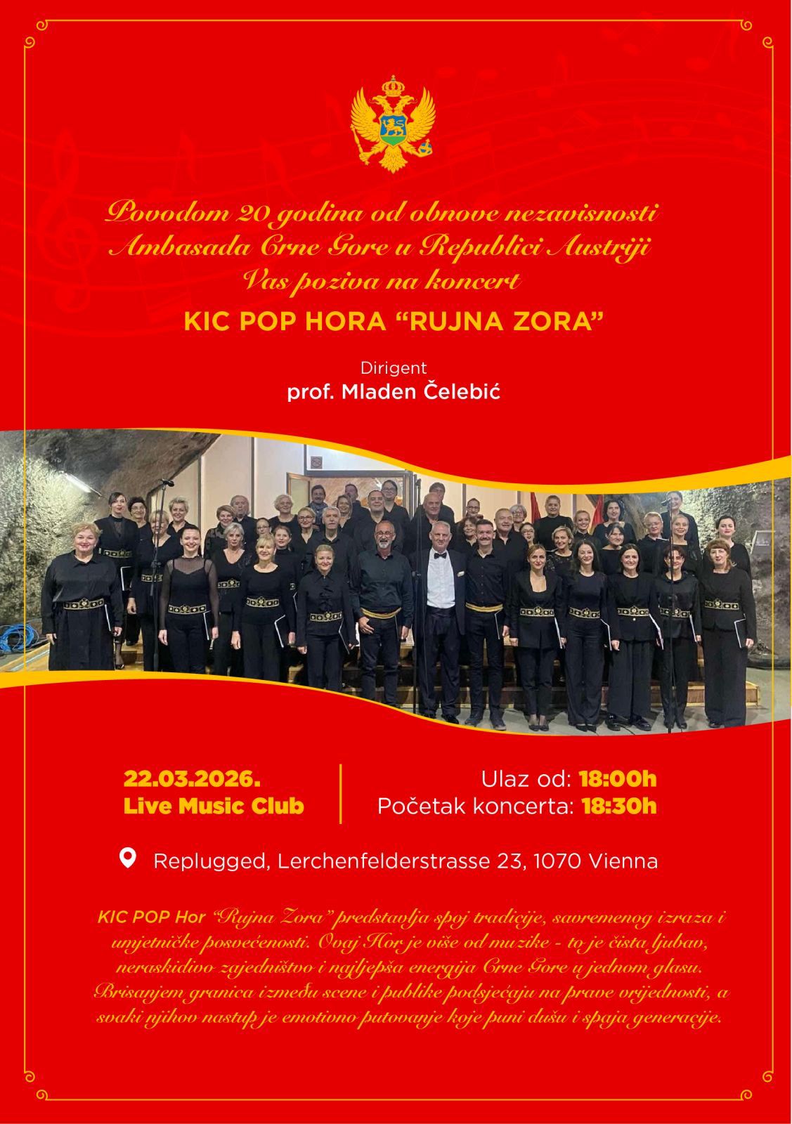 Prema riječima osnivačice i menadžerke hora Snežane Burzan Vuksanović, turneja je brižljivo pripremana više mjeseci, a veoma je ponosna što će osim koncerta na festivalu “Vienna Cantat” , KIC pop hor uz podršku ambasade Crne Gore u Beču, održati koncert “Rujna zora”, povodom 20 godina od obnove nezavisnosti Crne Gore, u nedjelju, 22. marta sa početkom u 18h, u klubu Replugged (Lerchenfelderstrasee 23), te pjesmom dati svoj doprinos obilježavanju ovog važnog jubileja naše države. Za tu priliku hor je pripremio mješoviti repertoar, pa će publika tokom sat ipo moći da uživa, uz crnogorske pjesme, i u dijelu bogatog pop repertoara i antifašističkog programa popularnog KIC pop hora.