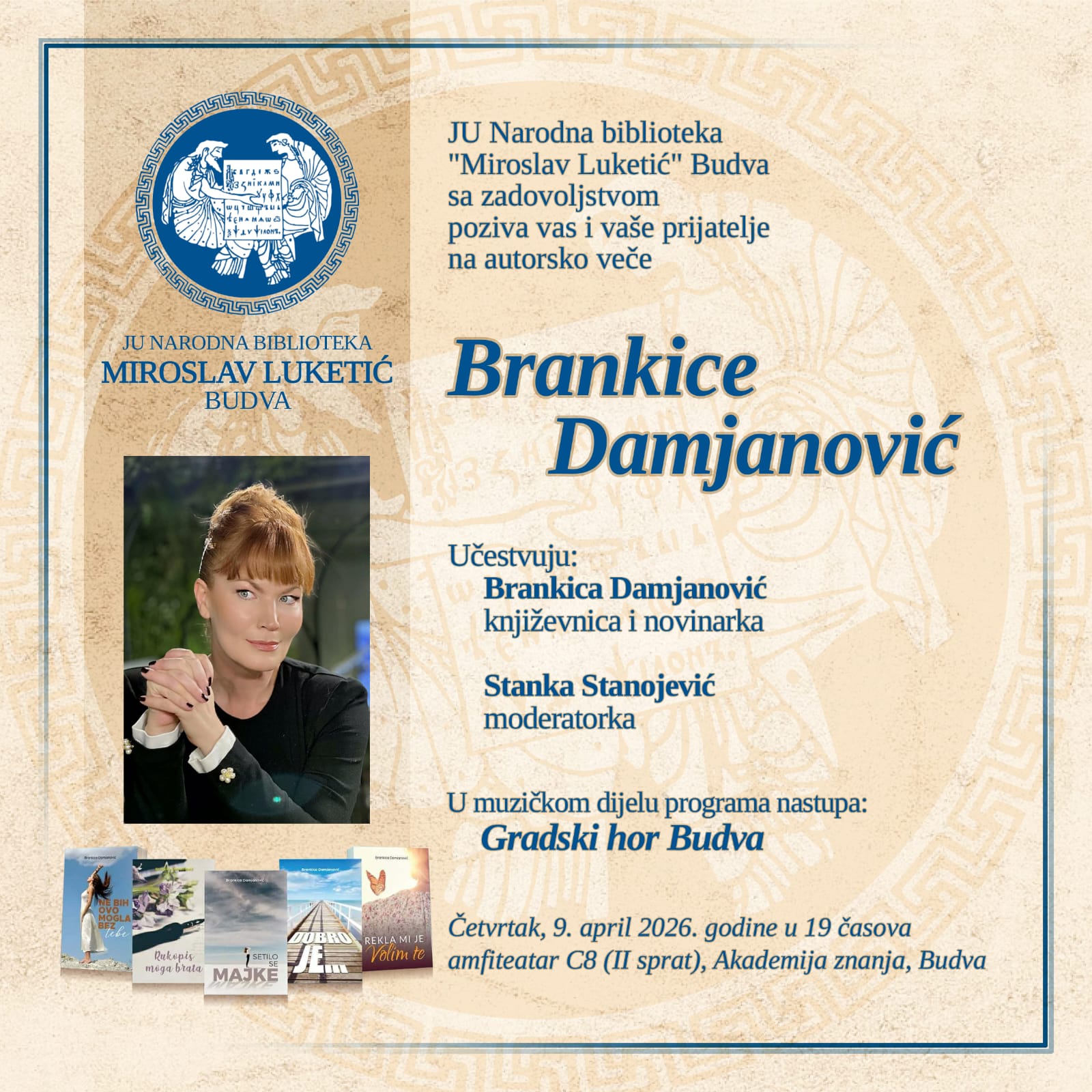 U četvrtak, 9. aprila u 19 h, u amfiteatru C8 na drugom spratu Akademije znanja u Budvi, biće upriličeno autorsko veče književnice i novinarke Brankice Damjanović iz Beograda, u organizaciji JU Narodne biblioteke „Miroslav Luketić“ Budva.
